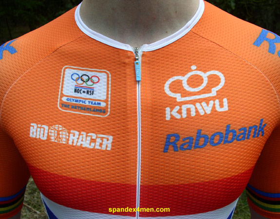 Uniek wielrenpak speciaal gemaakt voor een Nederlandse wereldkampioen baanwielrennen. Dit is te zien aan de regenboogstrepen op de mouwen.